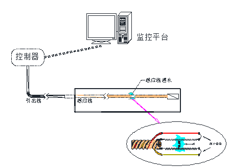 當有液體與感應線接觸時,兩根感應線內芯線遇液體導通,形成回路電阻,從而發(fā)生電流的變化,根據(jù)電阻和導體長度的比例關系,通過控制器的快速運算,發(fā)出報警信號,給出具體的泄漏位置。